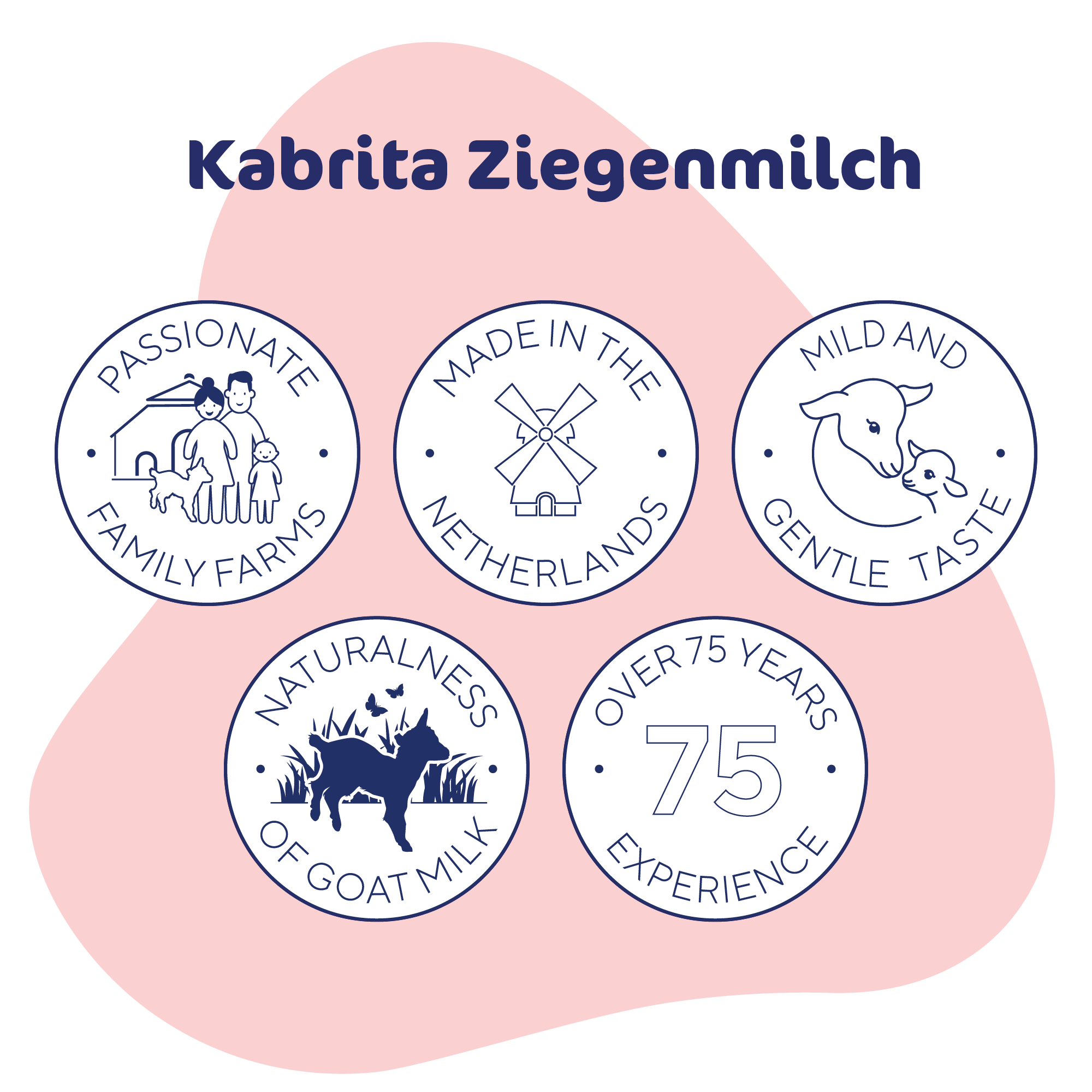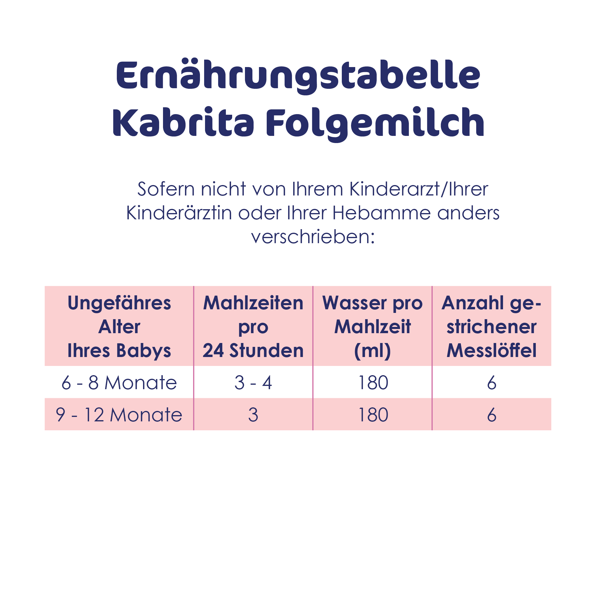 Stillen ist die beste Ernährung für Ihr Baby. Für die Gesundheit Ihres Babys ist es unerlässlich, dass Sie die Zubereitungs- und Aufbewahrungshinweise sorgfältig befolgen. Kabrita-Folgemilch kann in den ersten 6 Lebensmonaten nicht als Stillersatz gegeben werden. Kabrita- Folgemilch ist für Babys ab dem Alter von 6 Monaten als Teil einer ausgewogenen Ernährung geeignet. Wenden Sie sich für Unterstützung bei der Ernährung Ihres Babys an Ihren Kinderarzt/Ihre Kinderärztin oder Ihre Hebamme.