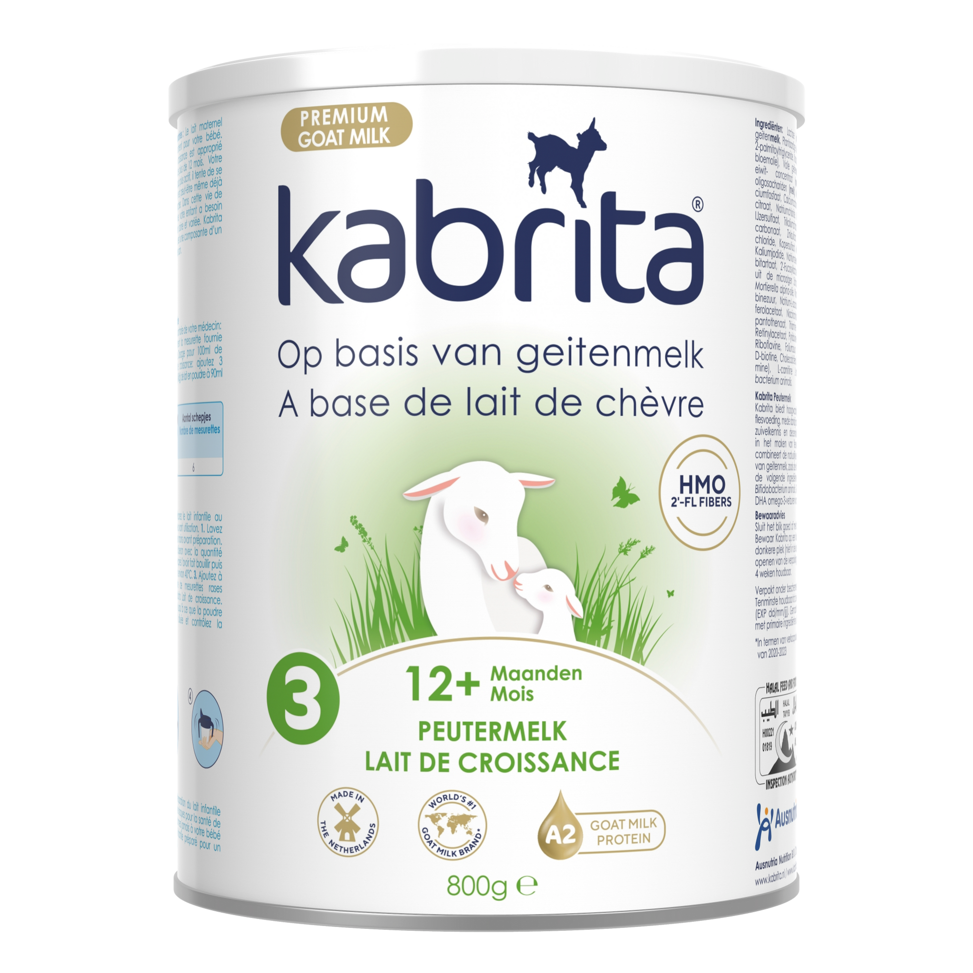 Kabrita 3 Ziegenmilch-Kleinkindmilch kombiniert die natürlichen Eigenschaften von Ziegenmilch, wie den milden Geschmack, mit den besten Zutaten wie Milchfett, dem wertvollen HMO 2’-FL, BB-12® Probiotika und DHA* Omega-3-Fettsäuren aus Algen. Die Flaschennahrung wird vollständig in den Niederlanden aus Ziegenmilch von unseren eigenen Ziegenfarmen hergestellt.