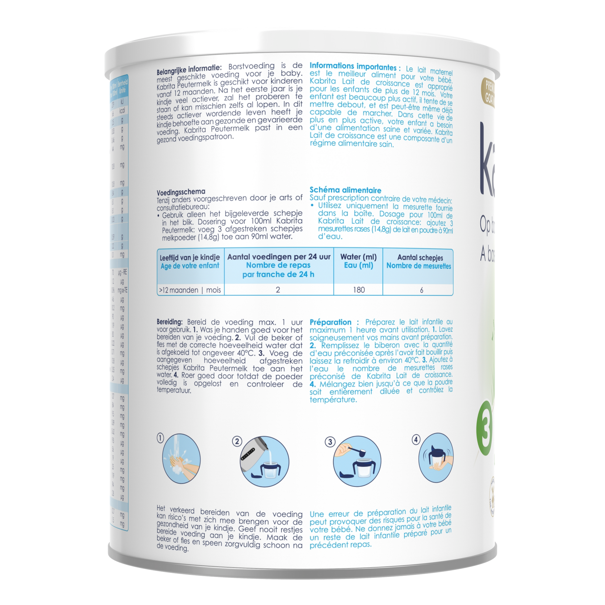 Die Empfehlungen variieren je nach Land, aber im Allgemeinen ist die Kabrita-Formulierung speziell für junge Kinder im Alter von 12 bis 36 Monaten entwickelt.