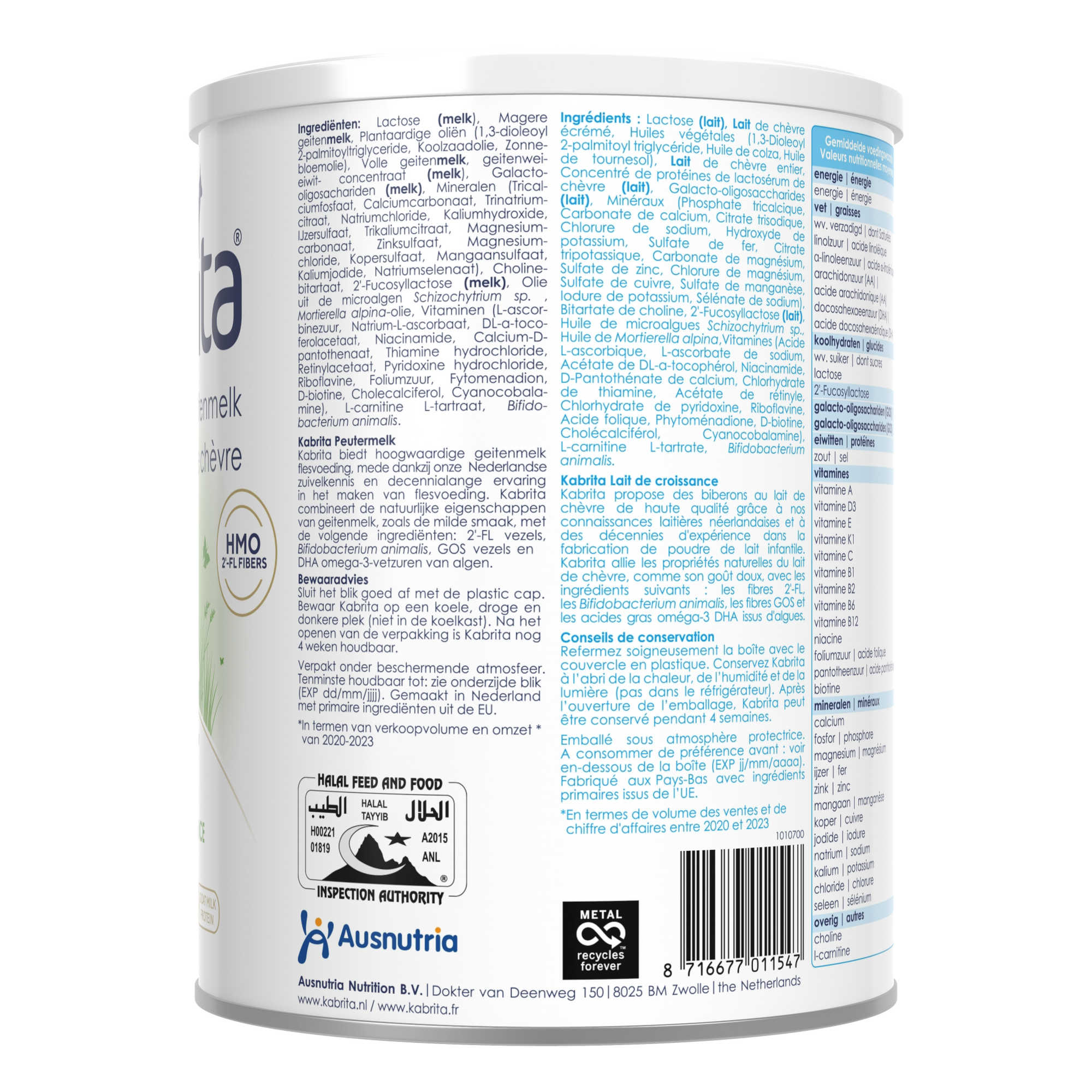 Verschließe die Dose gut mit dem Plastikdeckel. Bewahre Kabrita an einem kühlen, trockenen und dunklen Ort auf (nicht im Kühlschrank). Nach dem Öffnen der Verpackung ist Kabrita noch 4 Wochen haltbar.